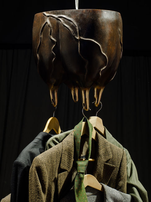 Instalación. Ubre de bronce, perchas de madera, ropa, cable de acero
